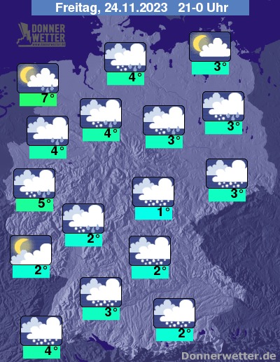 Am Freitagnachmittag und am Abend bleibt der Himmel über weiten Landesteilen stark bewölkt oder es ist bedeckt, dabei muss verbreitet mit Niederschlägen gerechnet werden und möglichen kurzen Graupelgewittern gerechnet werden. Die Schneefallgrenze liegt am Nachmittag bei 300 bis 600 m, an den Alpen sind bei einer bis in die Täler absinkenden Schneegrenze auch länger anhaltende Schneefälle zu erwarten.