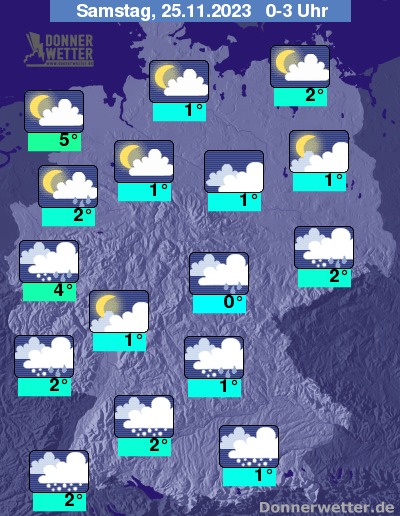 In der Nacht auf Samstag zeigt sich der Himmel, ausgenommen über den Küsten, zunächst stark bewölkt oder bedeckt und immer wieder sind Schauer möglich, die in der Nacht auch bis in tiefere Lagen als Schneeregen oder Schnee fallen können. Örtlich besteht Glättegefahr! In den frühen Morgenstunden können die Wolken über der Nordhälfte auch gebietsweise auflockern und es bleibt hier häufig niederschlagsfrei.