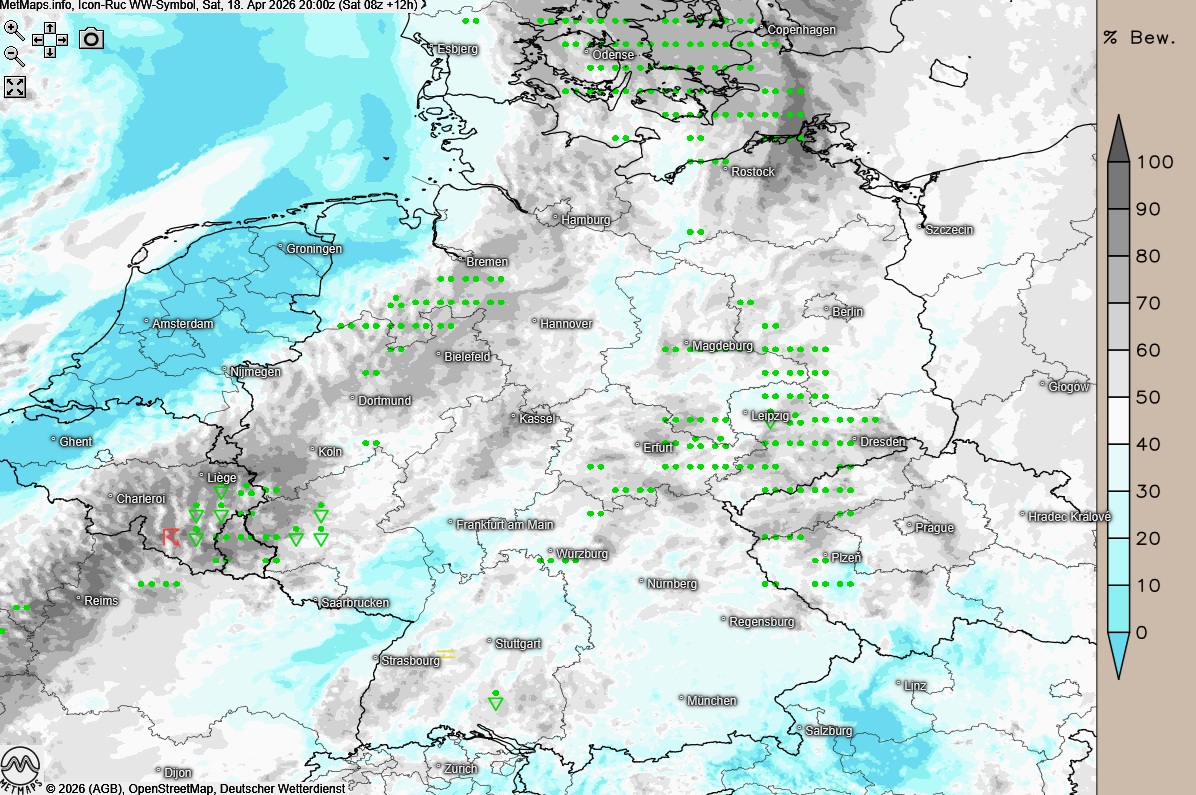 Am Samstagnachmittag verdichten sich die Wolken von Nordwesten zunehmend, dabei fällt am Nachmittag und Abend vor alllem im Westen und Nordwesten, der Mitte sowie im Südosten zeitweise Regen.