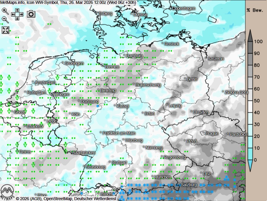 Am Donnerstag zeigt sich der Himmel über weiten Landesteilen wechselnd bewölkt; dabei ziehen im Tagesverlauf Regen- und Graupelschauer durch. Lokal sind auch Gewitter möglich. Die Schneefallgrenze liegt zwischen 300 und 600 Metern. Überwiegend trocken bleibt der Donnerstag im äußersten Nordosten Deutschlands - hier sind im Tagesverlauf auch heitere Abschnitte möglich.