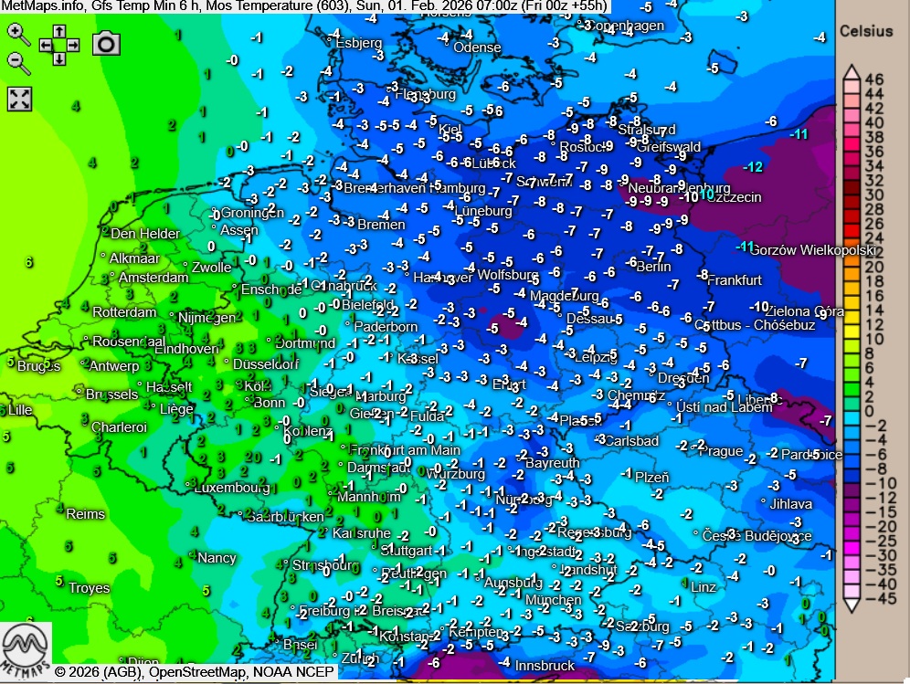 Die Temperaturkarte mit den Sechs-Stunden-Tiefstwerten sowie die Wetterkarte für 07:00 Uhr nach GFS: