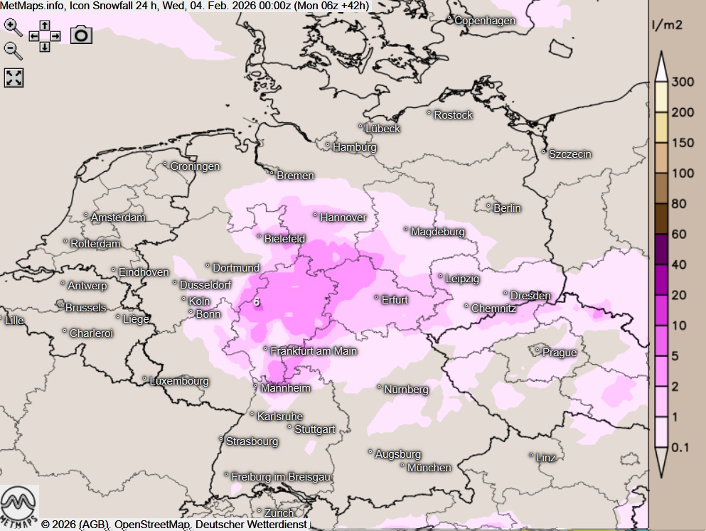 Die Wetter- und Temperaturkarte für Dienstagfrüh (06:00 Uhr) sowie die 24-Stunden-Schneemengen nach ICON: