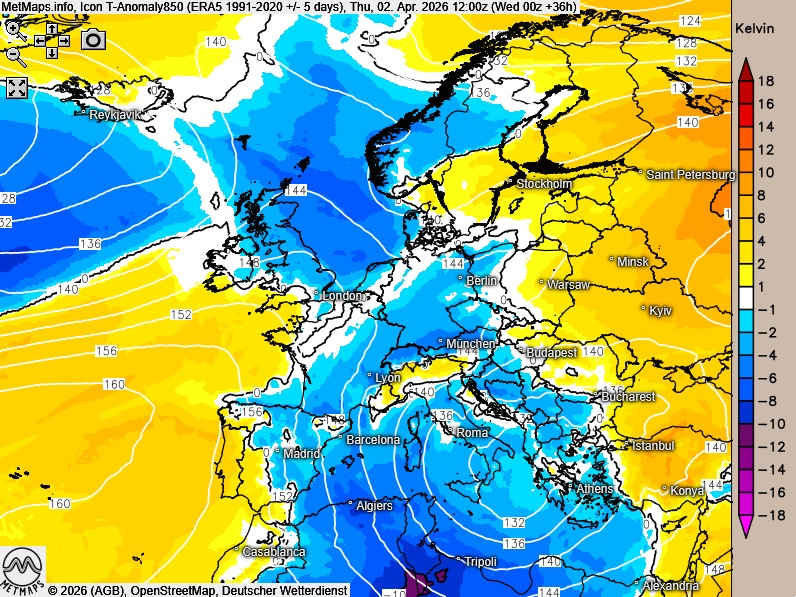 Die Wetterkarte (06:00 Uhr), Temperaturanomalie (12:00 Uhr) sowie Temperaturen um 15:00 Uhr nach ICON:
