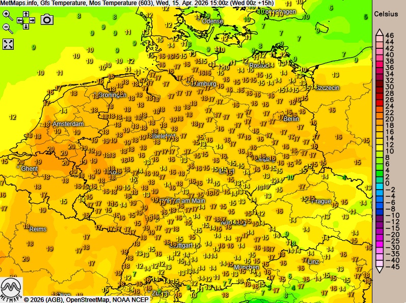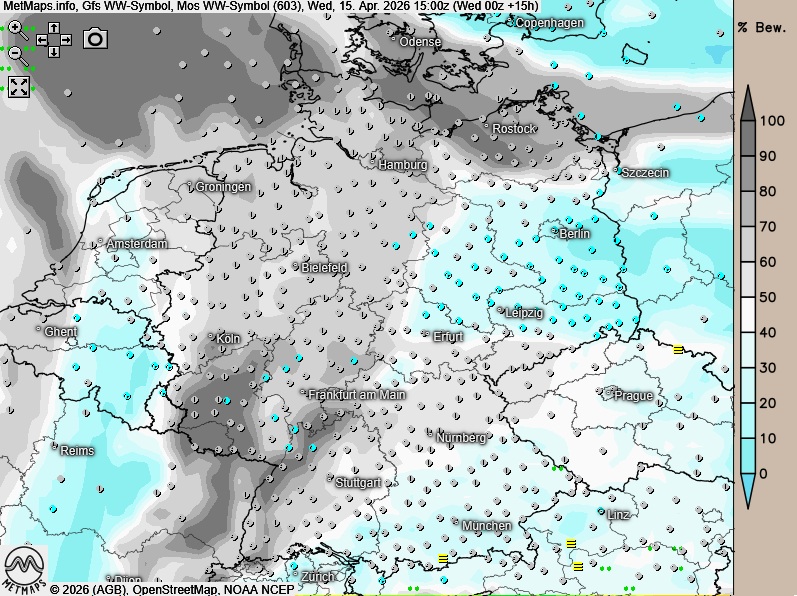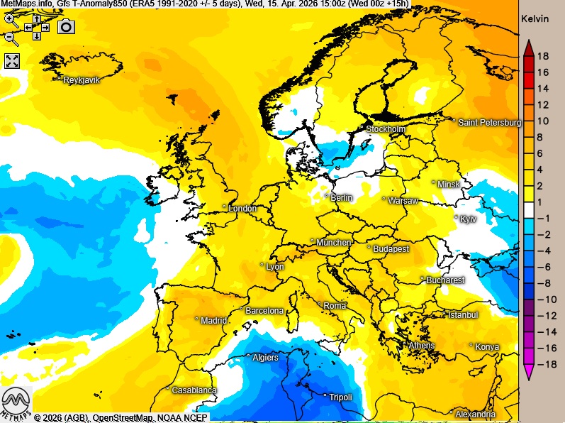 Die Temperatur- und Wetterkarte sowie die Temperaturabweichung für Mittwochnachmittag (15:00 Uhr) nach GFS: