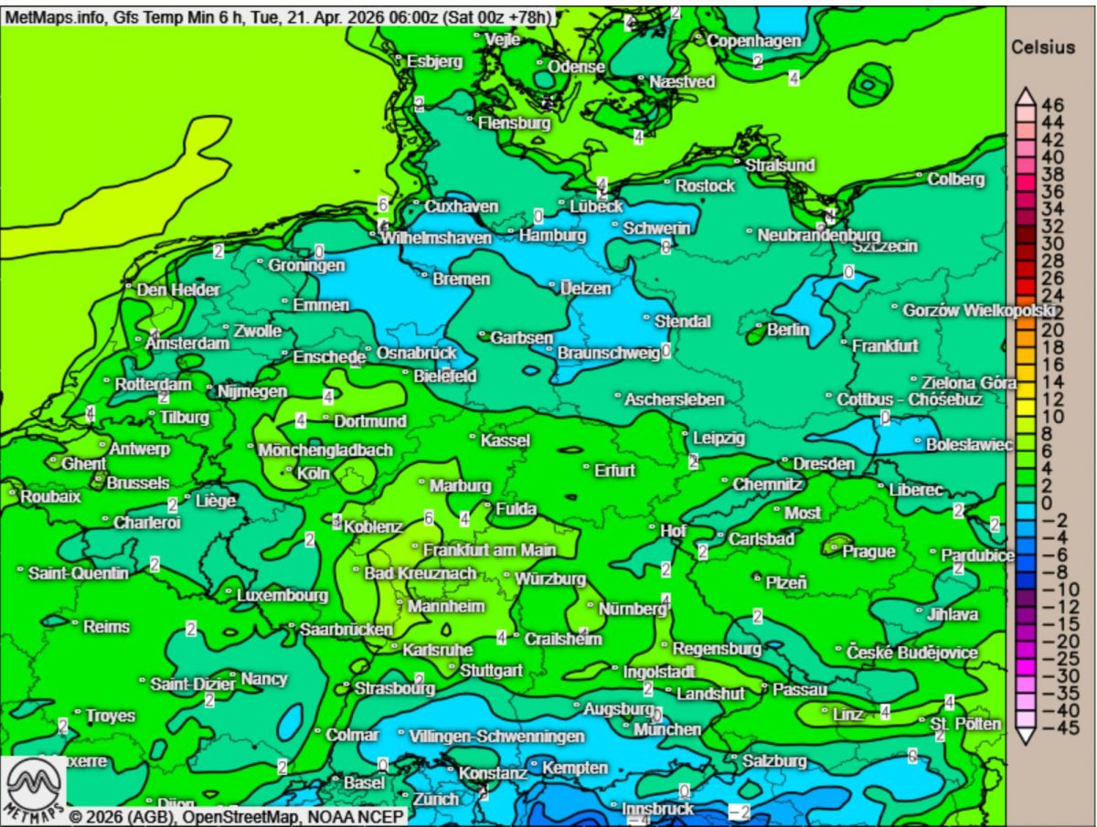 Damit könnte es lokal nochmals zu Bodenfrost kommen – insbesondere in klaren Nächten und windgeschützten Lagen.
