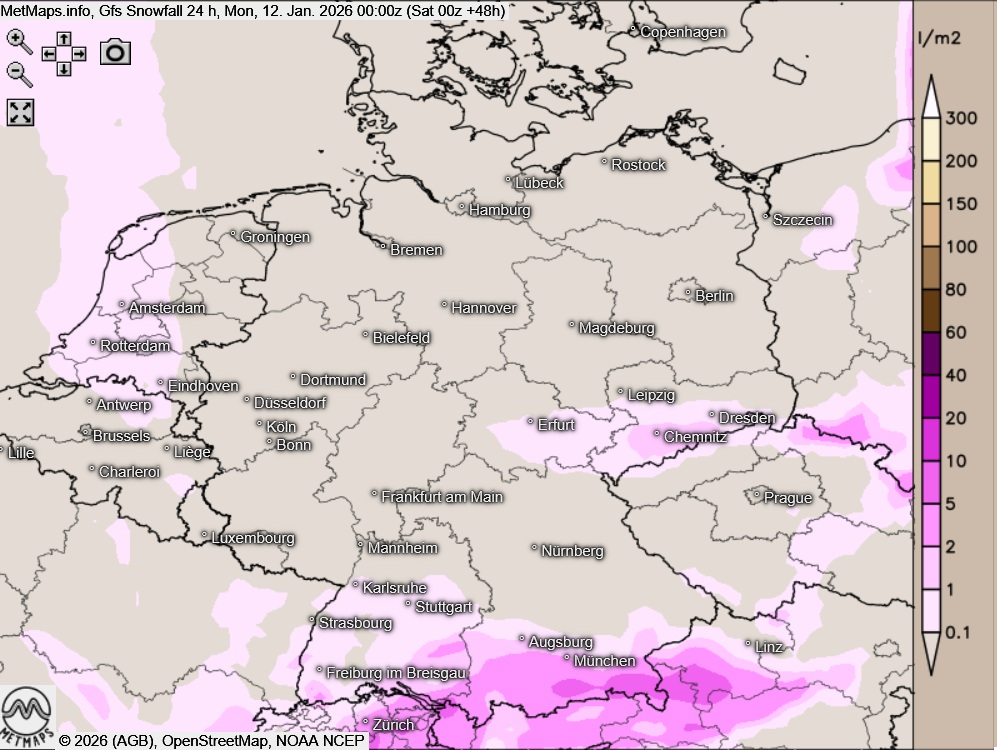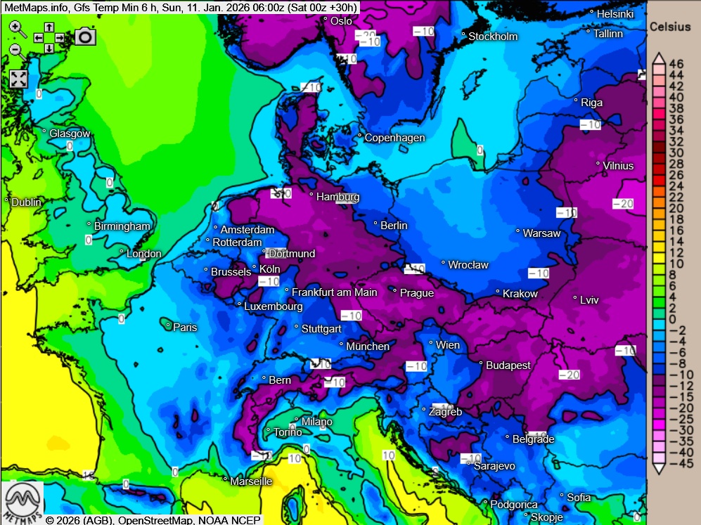Die Temperaturen erreichen Höchstwerte um -6 Grad im Vogtland und um 0 Grad am Oberrhein.
