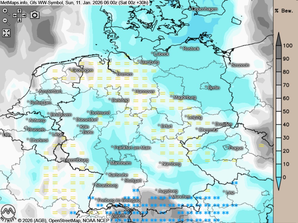 Am Sonntag fallen an den Alpen und im Südosten zunächst noch einzelne Schneeschauer. In den übrigen Landesteilen ist es heute meist heiter bis wolkig, vor allem im Nordosten sowie im Westen auch sonnig, und es bleibt niederschlagsfrei.