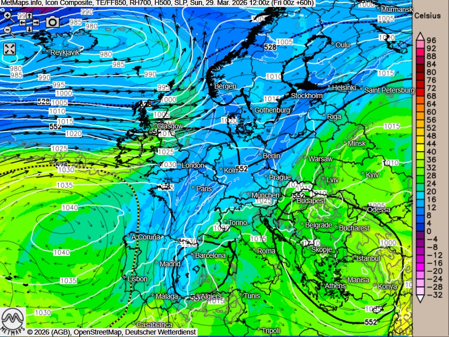 Die Strömungs- (12:00 Uhr) und Wetter- / Temperaturkarte (15:00 Uhr) sowie die 24-Stunden-Regenmengen für Sonntag nach ICON: