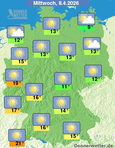 Am Mittwoch ist es wiederum oft von morgens bis abends durchweg nur sonnig. Hier und da ist aber auch leichte oder lockere Bewölkung möglich, jedoch bleibt es überall trocken. Die Höchstwerte liegen bei eher frischen 9 Grad an der Ostsee und bis zu 21 Grad am Oberrhein.