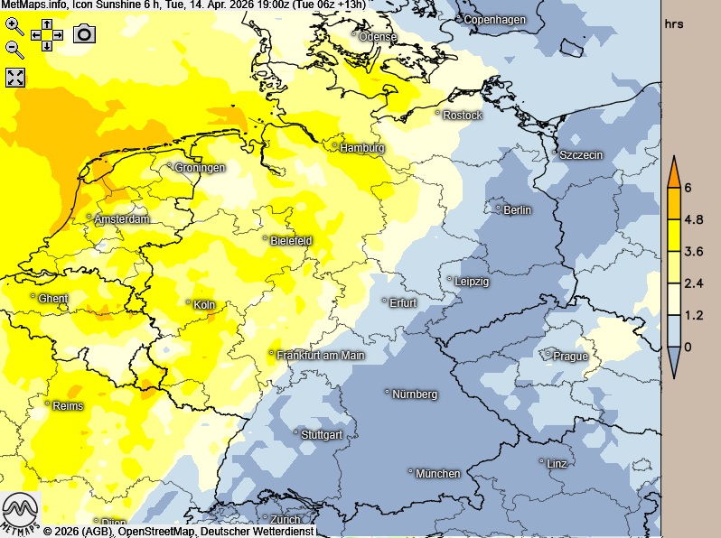 Die Wetter- und Temperaturkarte für 15:00 Uhr sowie die 6-Stunden-Sonnenscheindauer bis 19:00 Uhr nach ICON: