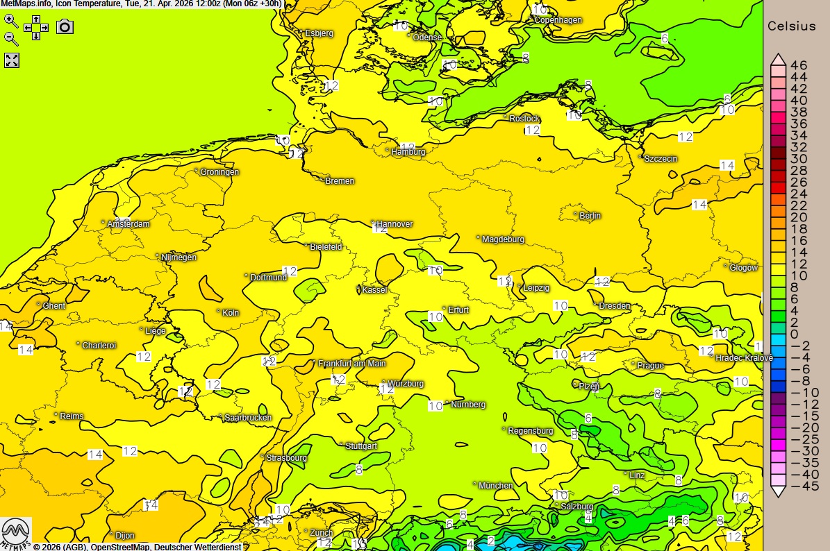Temperaturen Dienstagmittag (12:00 Uhr) nach ICON