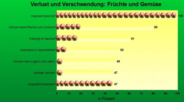 Dabei ist der Anteil der in Supermärkten und Haushälten verschwendeten Lebensmittel in den Industrienationen besonders hoch. In den Entwicklungsländern überwiegen hingegen die Verluste während der Ernte und des Transports.