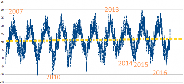 Dargestellt ist hier der Mitteltemperaturverlauf zwischen 2007 und 2016 in Westdeutschland.