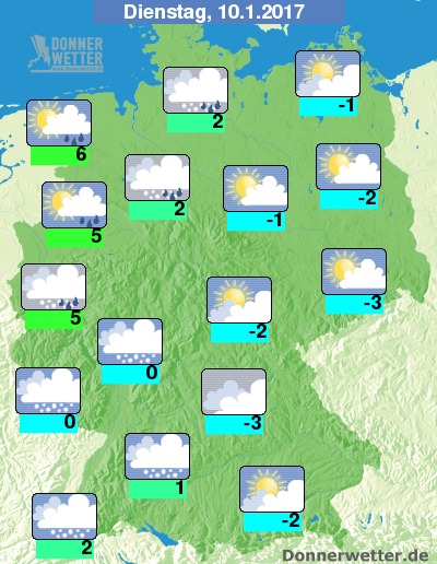 Der folgende Montag (09. 01) brachte Tagestemperaturen zwischen -2 Grad C in Bayern und +5 Grad C am Niederrhein und zeigt sich von seiner trüben, örtlich auch nebligen Seite. Abgesehen von etwas Sprühregen oder Schneegriesel blieb es aber trocken.