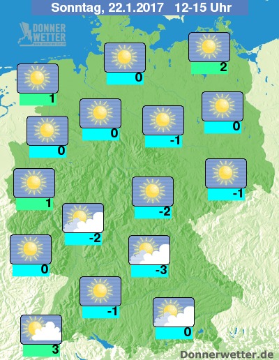 Mit etwas mehr Bewölkung musste man sich dann zur Wochenmitte (18.01.) hin arrangieren, vor allem im Norden und Süden war Sonne Mangelware. In der Mitte und im Südwesten schien dagegen häufiger die Sonne. Fast überall im Land herrschte Dauerfrost.
