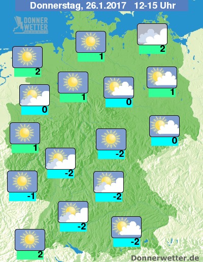 Der Donnerstag (26.01.) brachte da schon wieder deutlich mehr Lichtblicke (s. Karte links), nur im Südwesten und ganz im Norden blieb es über längere Zeit trüb. Im Norden und Westen wurden leichte Plusgrade gemessen, in der Südhälfte blieb es meistens noch bei leichtem Dauerfrost.