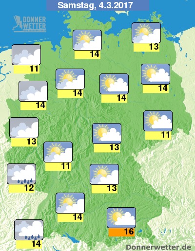 Im Nordwesten sorgte am Freitag (03.03.) eine Warmfront gebietsweise für etwas Regen, sonst gab es hohe und mittelhohe Wolkenschleier mit milchigem Sonnenschein. Im Nordosten schien die Sonne bis zu 10 Stunden. Die Temperaturen lagen verbreitet zwischen milden 10 und 15 Grad C. Am föhnigen Alpenrand wurden fast 17 Grad C erreicht.
