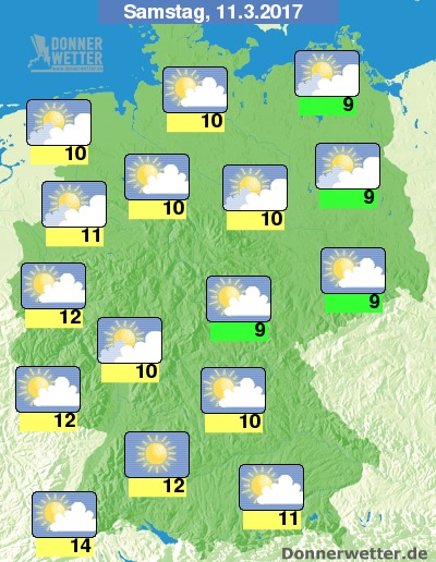 Zu Beginn der neuen Woche (13.03.) dominierten im äußersten Norden dichtere Wolken, in Schleswig-Holstein sowie in Hamburg regnete oder nieselte es am Nachmittag etwas. Sonst schien jedoch, abgesehen von hohen und mittelhohen Wolkenschleiern, zwischen 5 und 10 Stunden die Sonne. Vor allem im Westen und Südwesten kletterten die Temperaturen wieder auf 15 Grad C.