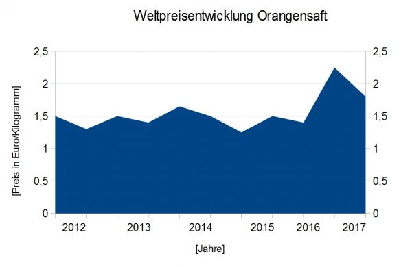 Eine drastische Preissteigerung auf dem Weltmarkt liegt zur Zeit bei Orangen bzw. Orangensaft vor. In den vorherigen Jahren hat sich der Preis größtenteils halten können, 2016 explodierte er dann. Meist kommen die Vitaminbomben aus Spanien, Italien, der Türkei oder Griechenland auf den deutschen Markt.