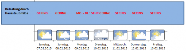 Trockenkalte Luft sorgt dafür, dass derzeit kaum Belastungen durch Hausstaubmilben bestehen. Lüften Sie ausreichend, damit die Innenraumluftfeuchtigkeit nicht über 50 % steigt.