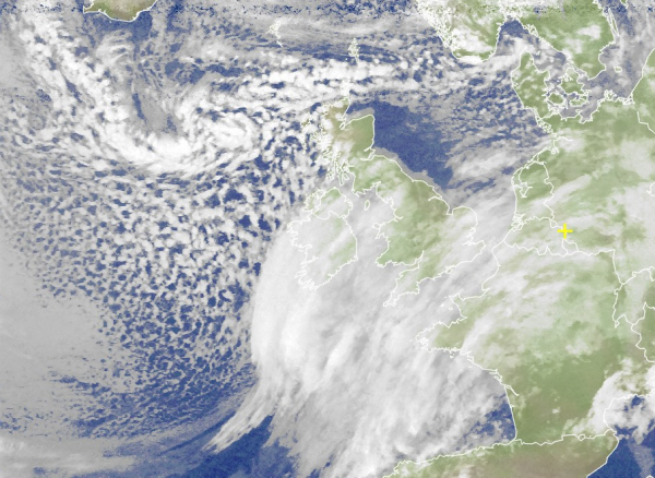 Vor Frankreich und den Britischen Inseln erkennt man bereits den Wolkenbatzen des sich zum Sturm entwickelnden Randtiefs "Egon".
