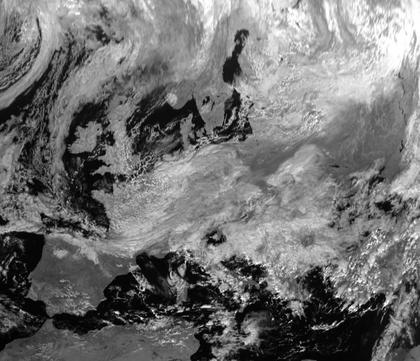 Auf der Rückseite von Tief 'Roswitha' mit Zentrum über Norditalien halten sich über Mitteleuropa dichte Wolken, die auch Regen bringen. Dänemark und Südschweden sind unter Hochdruckeinfluss bereits wolkenarm.