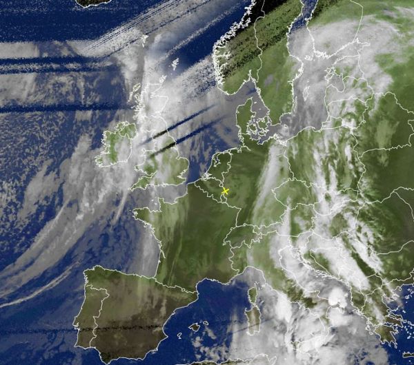 Auf dem Satellitenfoto von heute Nachmittag fallen insbesondere die hochreichenden Quellwolken im zentralen Mittelmeer auf, gut erkennbar an der helleren Weißfärbung und der kreisrunden Umrissform. Hier bildeten sich verbreitet Schauer und Gewitter, die regional auch sehr kräftig ausfielen.
