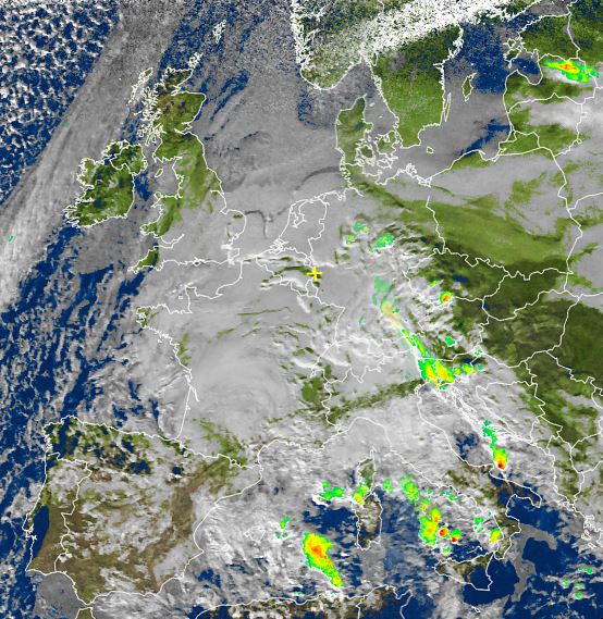 Auf dem Satellitenfoto von heute Nachmittag zeigt sich Europa unter einen oft verschlossenen Wolkendecke, dabei konnten sich in Deutschland nur die Menschen in Teilen des Nordens und des Ostens über etwas Sonnenschein freuen, sonst ließ der zähe Hochnebel meist keinen Weg frei für die Sonne. Auch im Mittelmeerraum ziehen verbreitet dichte Wolken durch, die hier gebietsweise für Schauer und einzelne Gewitter sorgen.