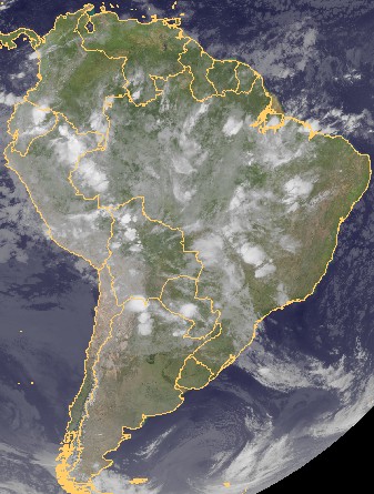 Auf dem heutigen Satellitenfoto von Südamerika erkennt man einen breiten Streifen mit starker Quellbewölkung vom Norden Perus über das östlichste Brasilien, Bolivien bis in den Norden von Argentinien. In dieser Zone entwickeln sich gebietsweise kräftige Schauer und Gewitter.