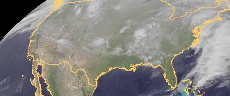 Auf dem heutigen Satellitenfoto ist ein ausgeprägtes Tiefdrucksystem, das sich von der nördlichen Atlantikküste bis über dem Nordosten der USA erstreckt, zu erkennen. In diesem Gebiet fällt unter weitgehend dichten Wolken teilweise kräftiger Regen, nach Norden hin fällt gebietsweise kräftiger Schnee.