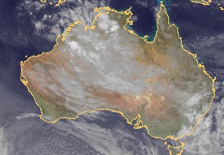 Das heutige Satellitenfoto zeigt viele Wolken über dem Nordwesten von Australien, hierbei fällt vielerorts Regen, der zum Teil länger anhält. Freundlicher und meist trocken ist es dagegen in weiten Teilen der Osthälfte und im Süden des Kontinents.