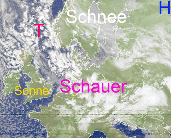 In der lebhaften Strömung und der labilen Schichtung der Atmosphäre ziehen weitere Schauerwolken über Mitteleuropa hinweg. Vereinzelt blitzt und donnert es dabei auch. In kräftigen Schauern sinkt die Schneefallgrenze bis ins Flachland, so dass es zu gefährlicher Glätte kommen kann. Zwischen den Wolken gibt es kurze sonnige Momente.
