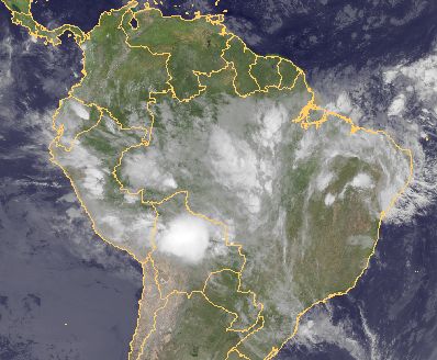 Über Brasilien und Bolivien haben sich kräftige Schauer und Gewitter entwickelt. Diese entstehen jahreszeitlich bedingt in Zusammenhang mit der innertropischen Konvergenzzone.