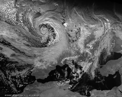 Auf dem heutigen Satellitenfoto von Europa ist eindrucksvoll das Orkantief bei den Britischen Inseln zu erkennen. Hierbei werden verbreitet stürmische Böen und teils sogar Orkanböen erreicht. Weiter im Süden und Osten Europas ist das Wetter ruhiger und es fällt nur hin und wieder Regen. Verbreitet scheint aber auch die Sonne.