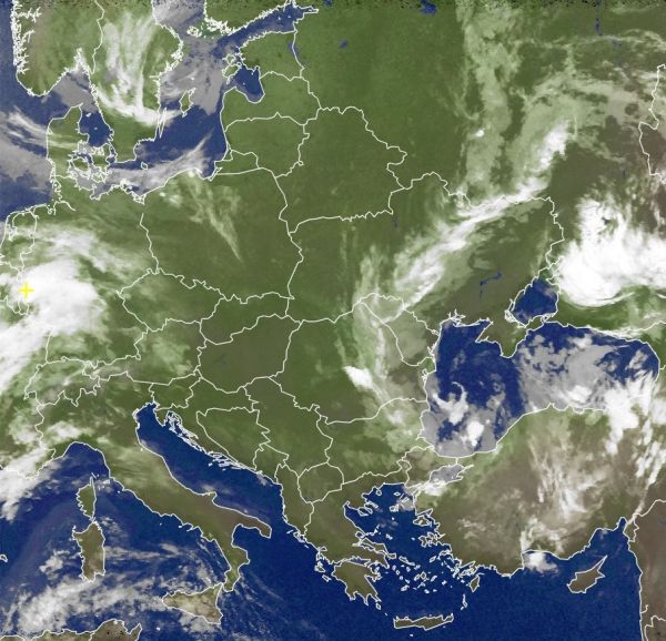 Ein weiteres Tief vor der Atlantikküste Frankreichs bringt zurzeit feucht-warme Luftmassen nach Mitteleuropa, die von Frankreich bis nach Tschechien zu teils heftigen Schauern und Gewittern führen.