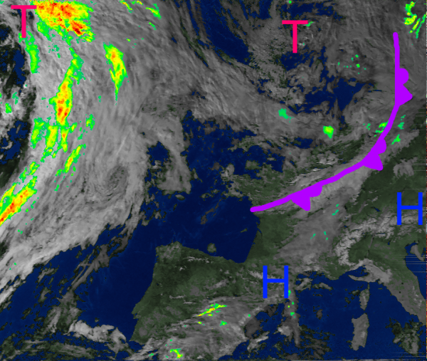 Die wolkenfreie Zone über der Biskaya (etwa Bildmitte) gehört zu einem sich aufbauenden Hochdruckgebiet, das am Wochenende zu einer erneuten Wetterbesserung in Deutschland sorgt.