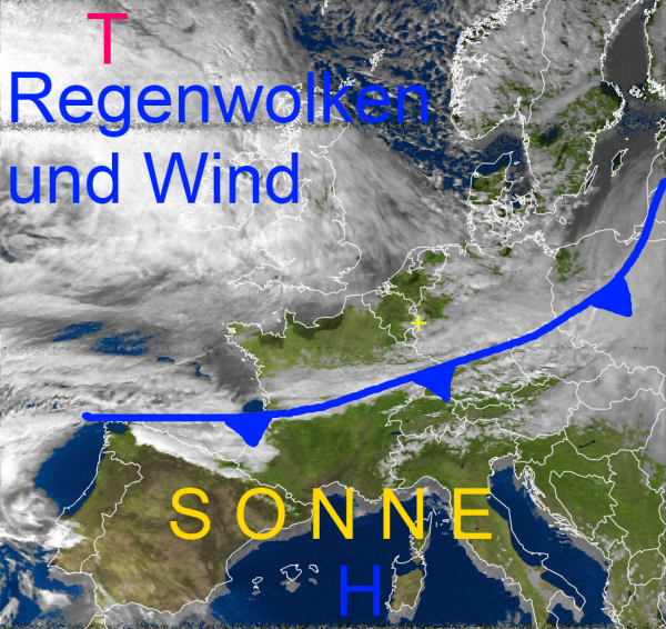 Auf dem heutigen Satellitenbild erkennt man den riesigen Wolkenbatzen über den Atlantik, der direkt auf Mitteleuropa zusteuert. Darin verbergen sich Tiefdruckgebiete mit ihren Schlechtwetterfronten, die ab der kommenden Nacht in Deutschland für reichlich Regen und lebhaften Wind sorgen werden.