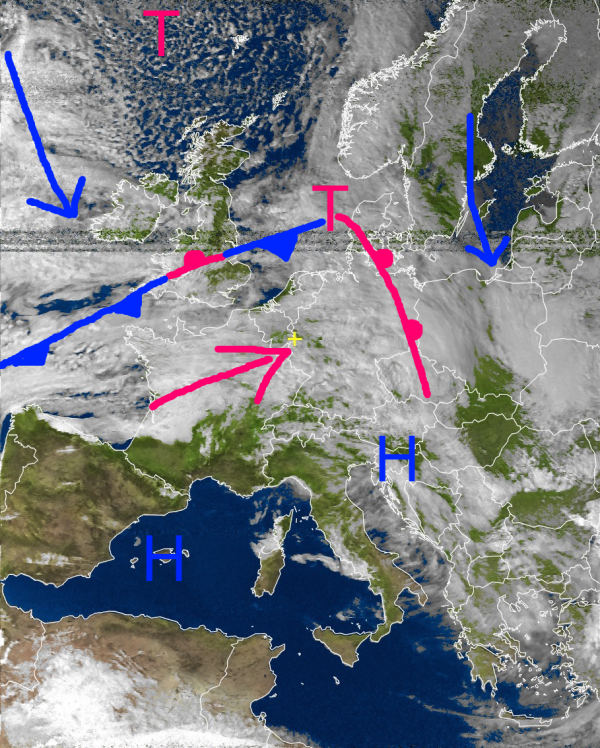 Auf dem heutigen Satellitenbild erkennt man die Wolken der Warmfront, die momentan im Nordosten Deutschlands für Regen und Sprühregen sorgen. Anfangs mischen sich in der kälteren Luft teilweise noch Schneeflocken unter den Regen. Hinter der Front gelangt wieder mildere Luft nach Deutschland. In Köln und Frankfurt sind es derzeit schon 15 Grad.