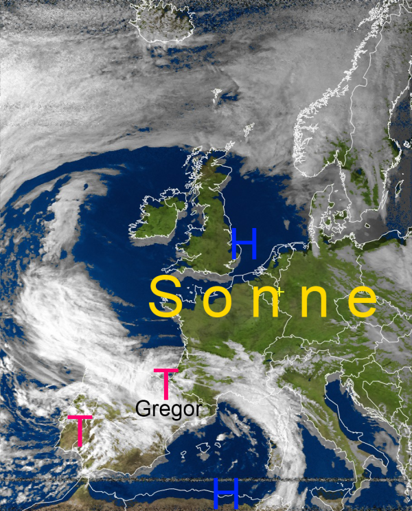 Dank des Hochs bei den Britischen-Inseln scheint über weiten Teilen West- und Mitteleuropas die Sonne. Dagegen schaufelt Tief Gregor über Südwesteuropa immer noch viele Regenwolken nach Südfrankreich und Spanien. Teilweise fielen hier seit gestern schon über 60 Liter / m“. Auch über den Balearen fiel reichlich Regen. In den Pyrenäen fällt zum Teil Schnee bis unter 1000 m.