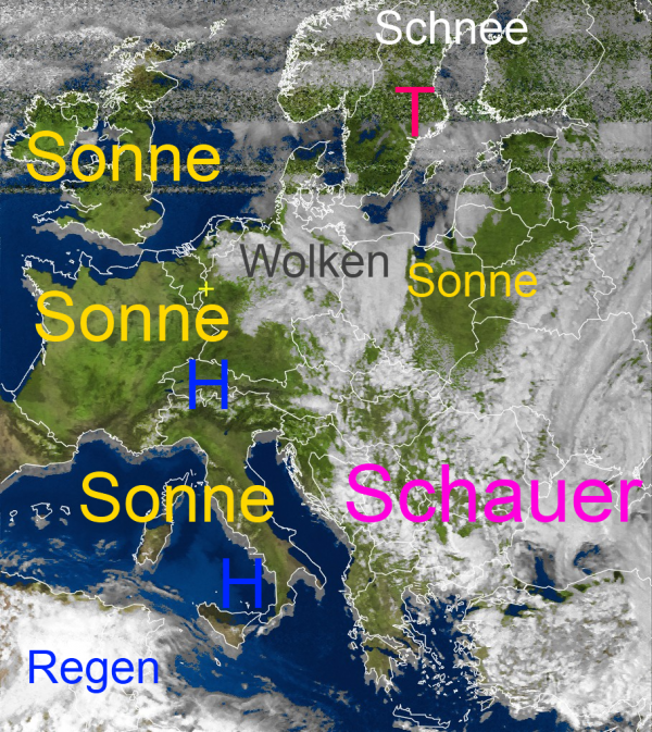 Viel Sonne und wolkenfreier Himmel gibt es von den Britischen-Inseln, über Frankreich bis nach Italien.