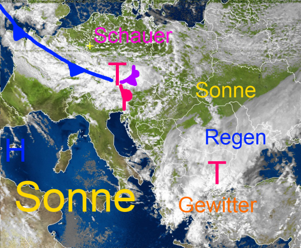 Wesentlich freundlicher mit reichlich Sonnenschein sieht es dagegen über dem zentralen Mittelmeerraum und Osteuropa aus.
