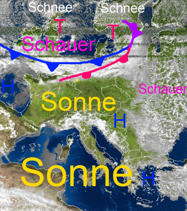 Über weiten Teilen Mitteleuropas scheint zunächst noch verbreitet die Sonne. Auch über dem Mittemeerraum trübt kaum eine Wolken den Himmel.