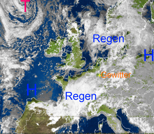 Hinter der Kaltfront beruhigt sich dann morgen zumindest vorübergehend das Wetter im Lande und die Schwüle der verganenen Tage wird durch angenehmere Atlantikluft ersetzt.