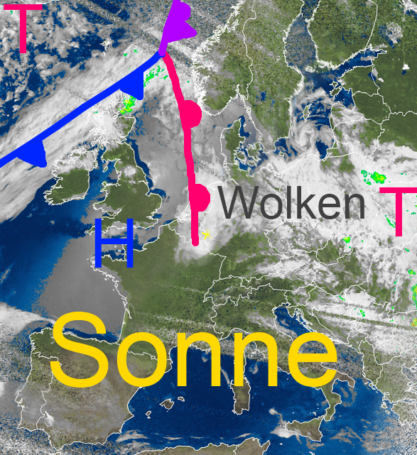 Die Wolken im Westen sind mit einer Warmfront in Verbindung zu bringen, die sich jedoch nach Norden zurück zieht. Die Wolken lösen sich allmählich auf, so dass morgen die Sonne meist uneingeschränkt scheinen kann.
