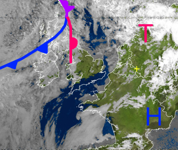 Die Fronten bei den Britischen-Inseln haben zunächst noch keinen Einfluss auf unser Wetter. Sie trennen allerdings Großbritannien in einen sehr warmen und freundlichen Süden von einem unbeständigeren und kühleren Norden. Auch in Irland ist es momentan wechselhaft mit Temperaturen meist unterhalb von 20 Grad.
