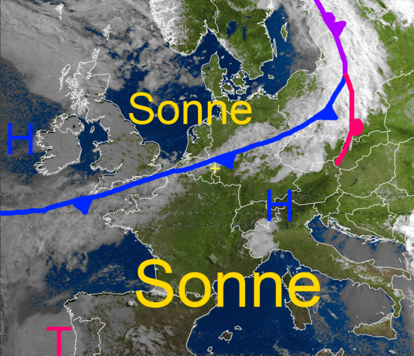 Eine über der Mitte Deutschlands liegende Luftmassengrenze spaltet Deutschland in einen sommerlichen Süden und in einen gemäßigten Norden. Während jeweils im Norden und Süden des Landes überwiegend die Sonne strahlt, halten sich über der Mitte, also im Bereich der Luftmassengrenze dichtere Wolken, aus denen es gebietsweise regnete. Mit etwas sonniger Einstrahlung haben sich am Nachmittag örtliche Schauer und im Osten auch einzelne Gewitter gebildet.