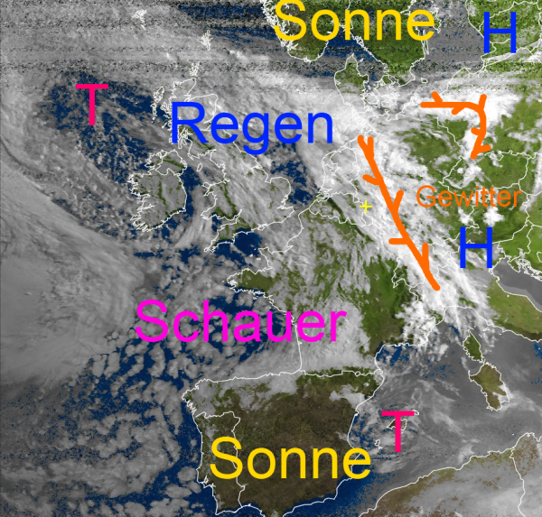 In der schwül-warmen und labilen Luftmasse über Mitteleuropa entwickeln sich Schauer- und Gewitterstaffeln, die allmählich nach Osten vorankommen. Dabei drohen auch örtliche Unwetter mit Platzregen und Hagelschlag. Bis zum Wochenende bleibt es sommerlich warm und schwül und es können gebietsweise weitere zum Teil kräftige Schauer und Gewitter auftreten.