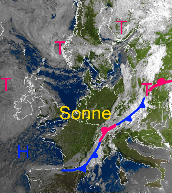 Die wellende Kaltfront hat die Alpen erreicht und sorgt hier für teils kräftige Regenfälle. Hinter der Front hat sich die Wetterlage beruhigt. Bei angenehmen Temperaturen scheint über Mitteleuropa häufig die Sonne von einem leicht bewölkten Himmel.