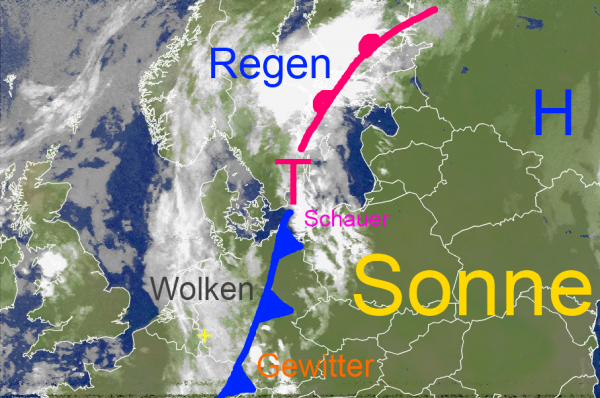 Vor der Kaltfront wurde es im Osten unseres Landes nochmals sommerlich warm, dahinter erreichen die Temperaturen jedoch kaum mehr 20 Grad. Vor allem in der Südosthälfte Deutschlands muss heute und morgen mit teils kräftigen Regenfällen gerechnet werden. Dabei können Mengen von örtlich über 50 Liter pro Quadratmeter auch kleinräumige Überschwemmungen, sowie Aquaplaning auslösen.