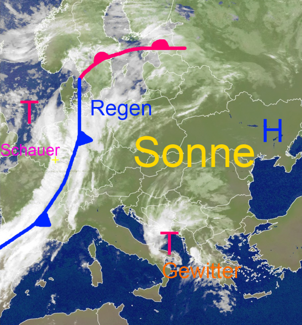 Die Kaltfront des Tiefs über der Nordsee überquert Deutschland von West nach Ost und bringt teils kräftige Regengüsse. Auf der Rückseite der Front bilden sich in der Höhenkaltluft auch örtliche Gewitter.